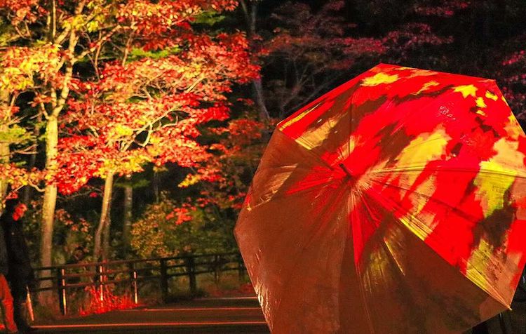 木々を彩る紅葉のライトアップと足元で光と戯れる