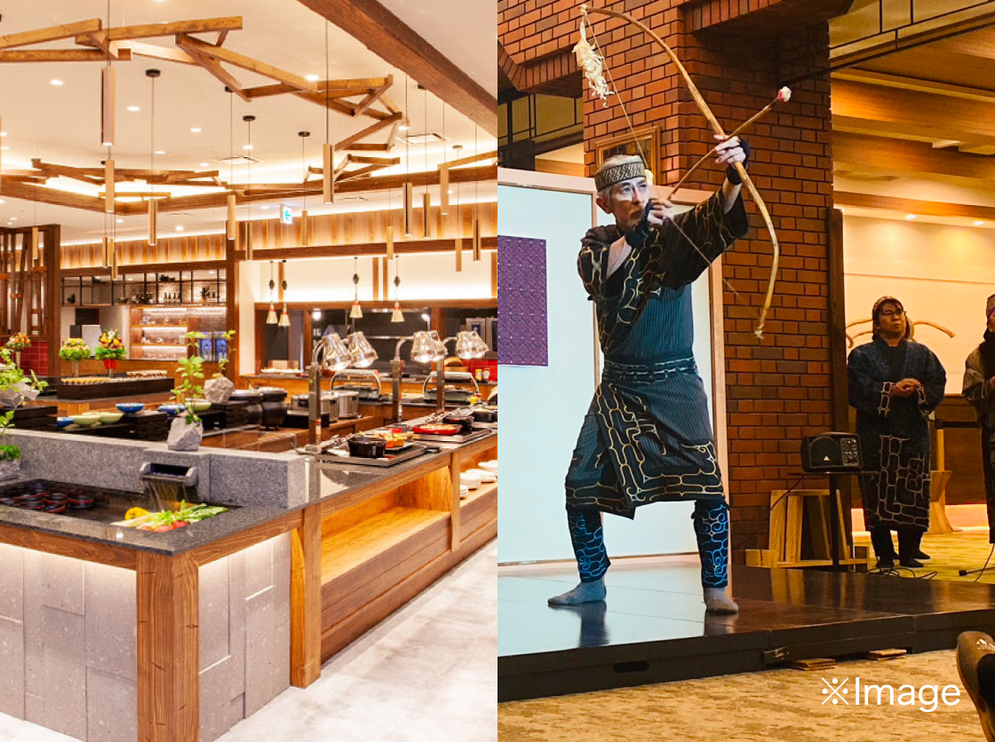 우에가와에서 계승되어 온 아이누 고식 무용을 감상 · 체감 할 수있는 특별한 시간을!아이누 문화에 가까이서 만지는 비일상 체험을 즐길 수 있습니다!저녁에는 아이누 요리도 즐길 수 있는 뷔페가 준비되어 있습니다.