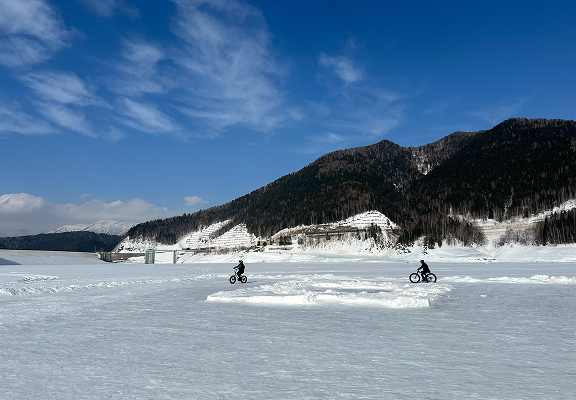 「全面凍結のダム湖へ!視界いっぱいの雪原に飛び込む非日常の滑走体験