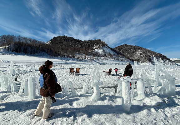 夏では見れないダム湖の中からの景色とそれを氷のメリーゴーランドに乗って楽しめる!氷結したダム湖を円形に切出し、手動で切出して浮いている氷を回転させて、その上に乗って360度のパノラマを体験!!